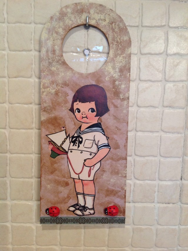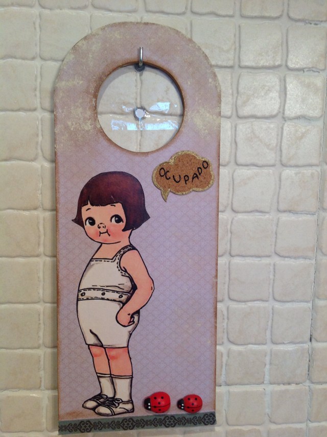 El cuelgapuertas del niño lo he hecho pensando en el aseo del restaurante de unos amigos de Pinto.Espero que les guste.