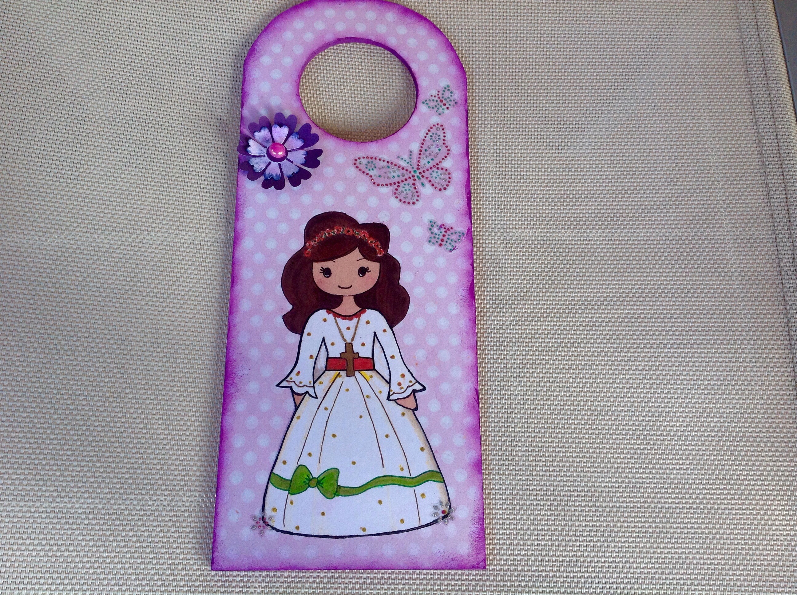 Este cuelga puertas es un encargo para la comunión de Carla.Espero que le guste mucho.