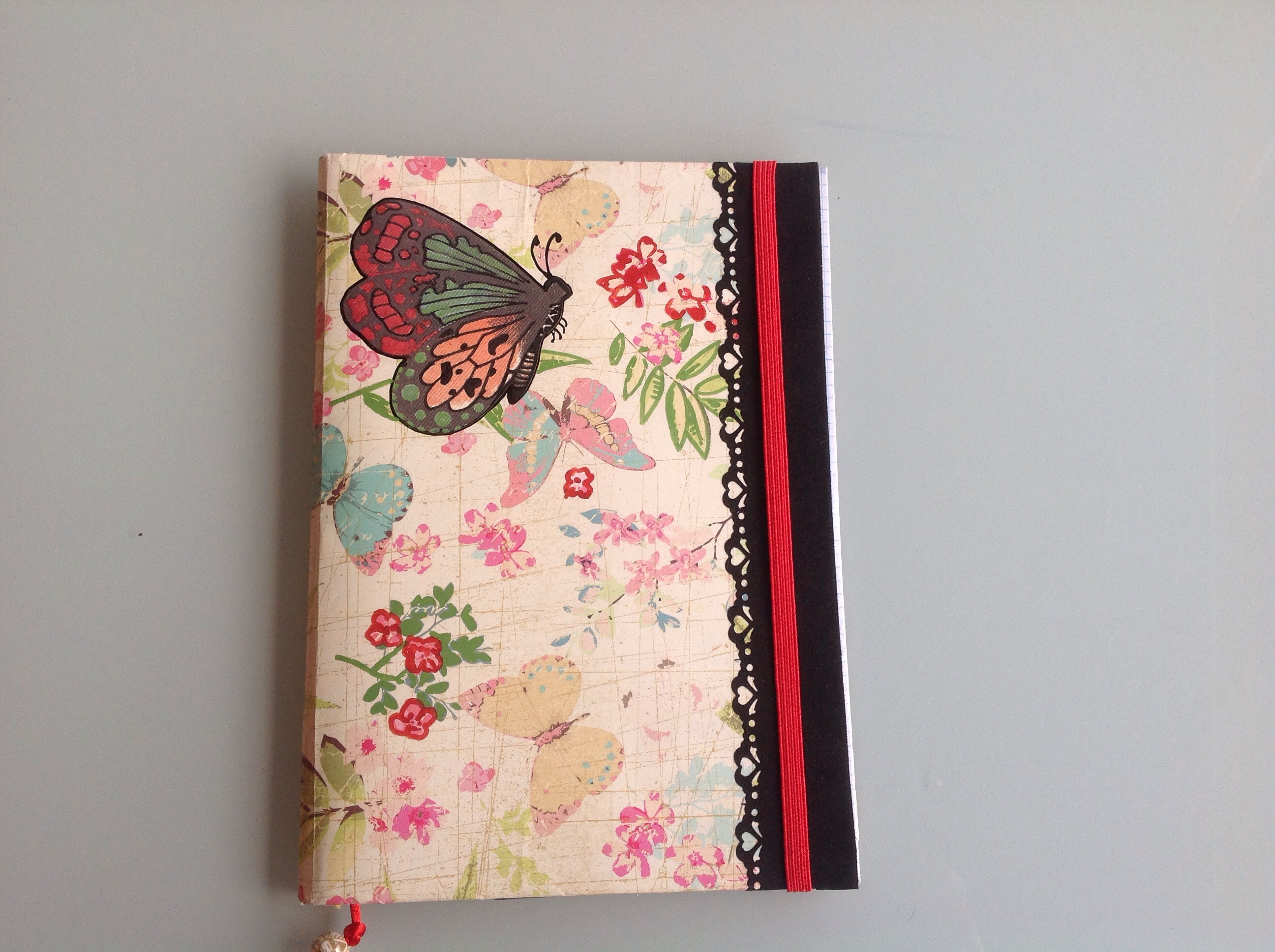 Cuaderno escolar decorado con papel de mariposas y gomita, tipo MOLESKINE