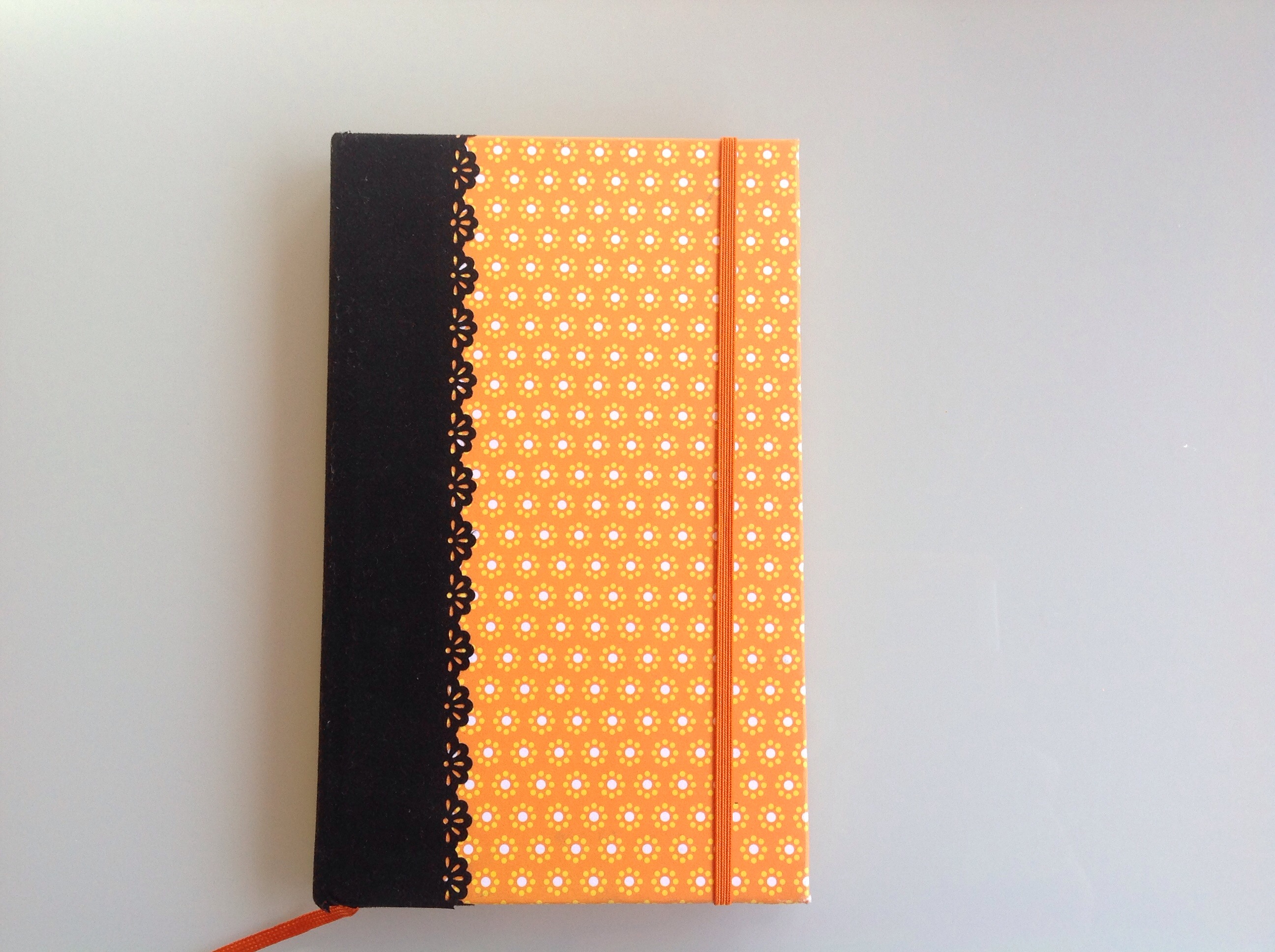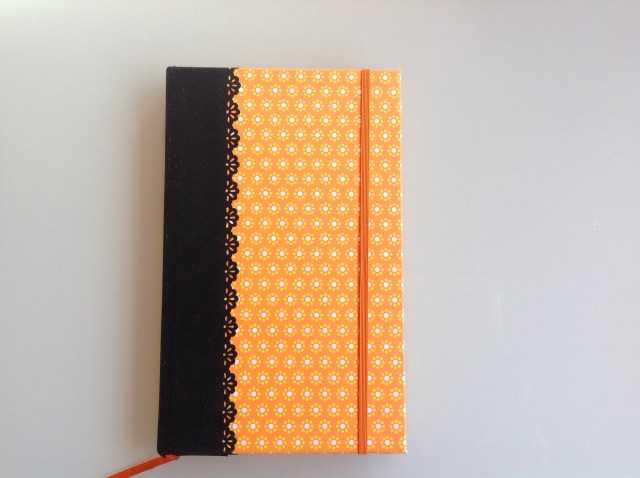 Cuaderno tipo Moleskine en florecitas amarillas.